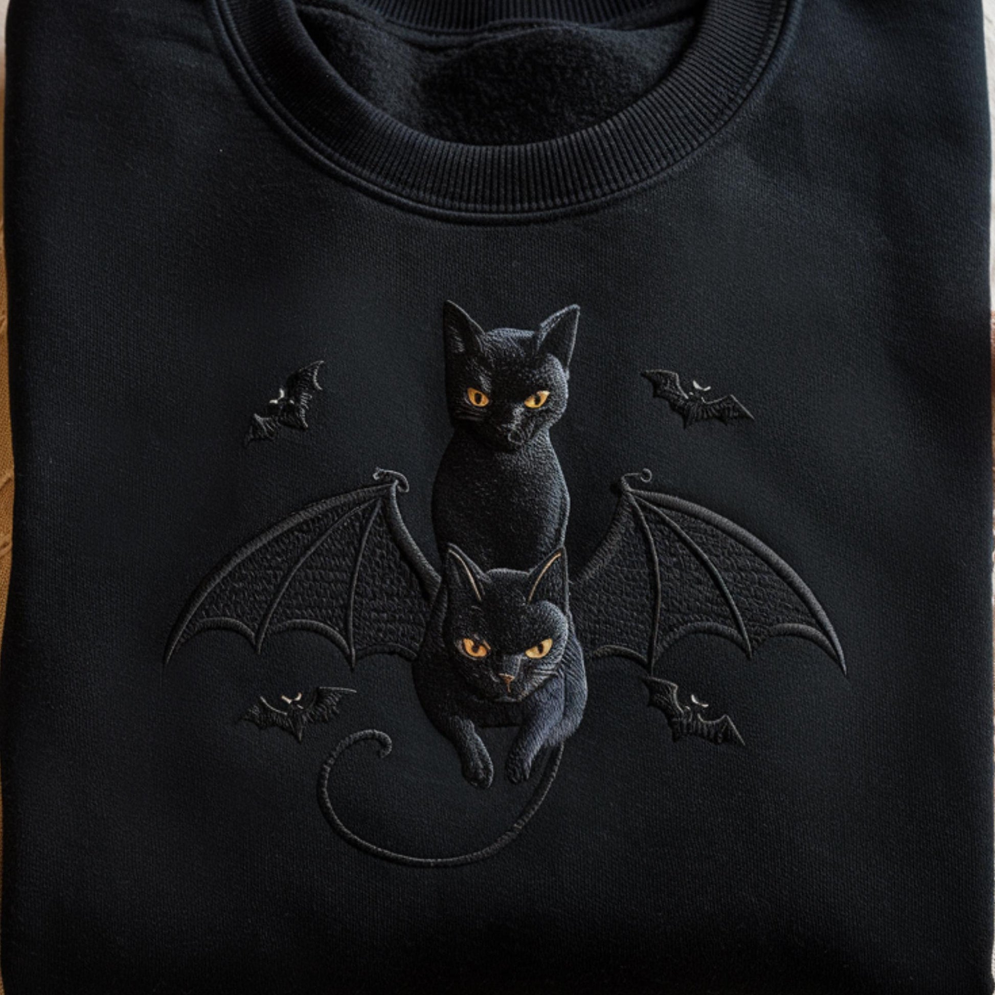 Embroidered Halloween Black Cat Sweatshirt: Gothic Bat Tee