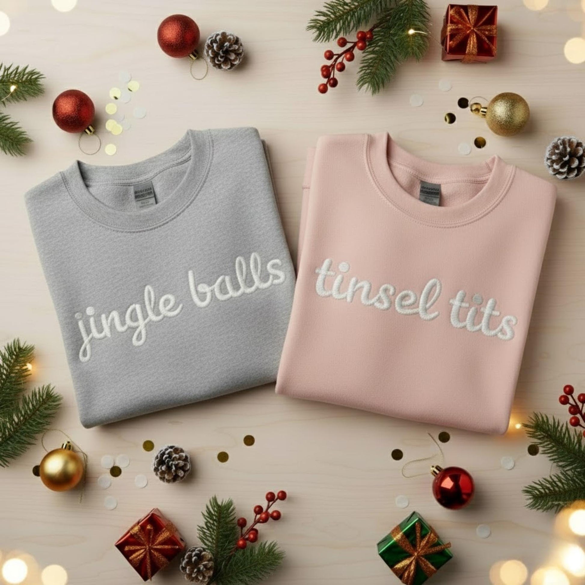 Holiday Embroidered Couple Sweatshirt Matching Christmas Sweatshirt Jingle Balls Tinsel Tits Funny Gift Yarn Embroidery Sweet Couple Gift