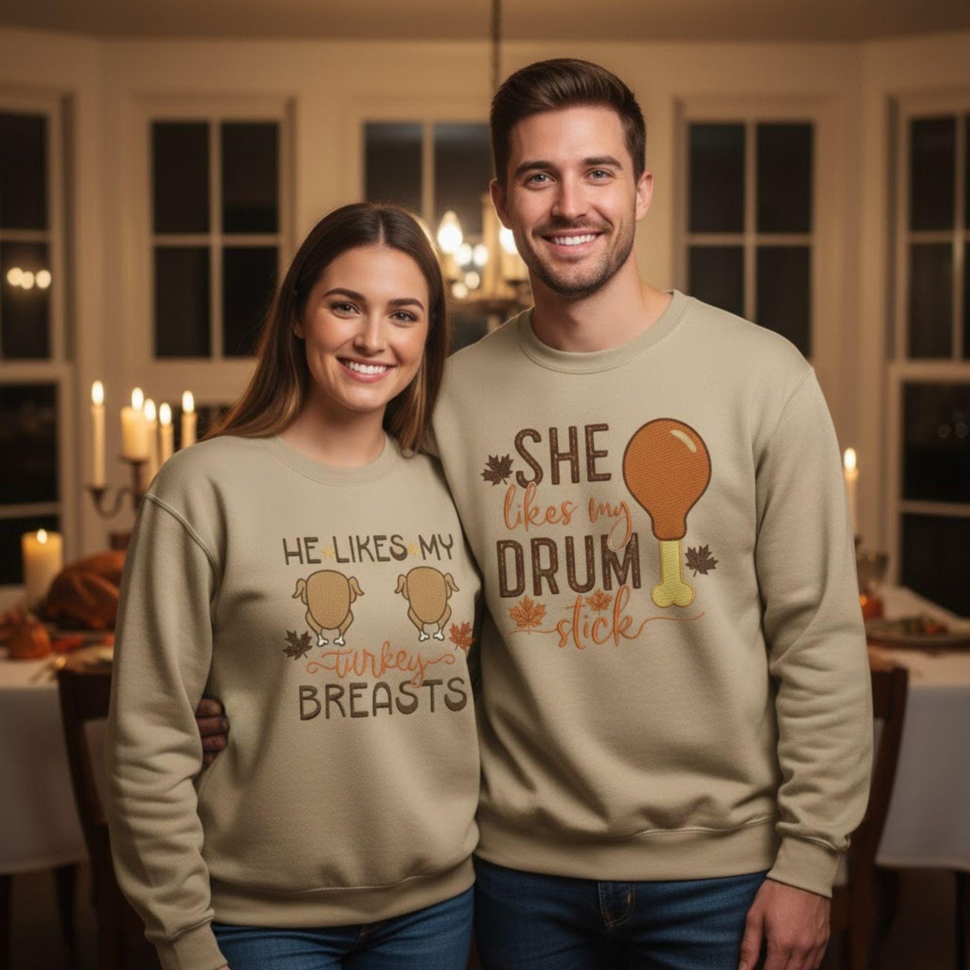 Matching Embroidered Thanksgiving Couple Sweatshirt Turkey Breast Drumstick Humor Fall Vibes Personalized His And Hers Sweatshirt Gift